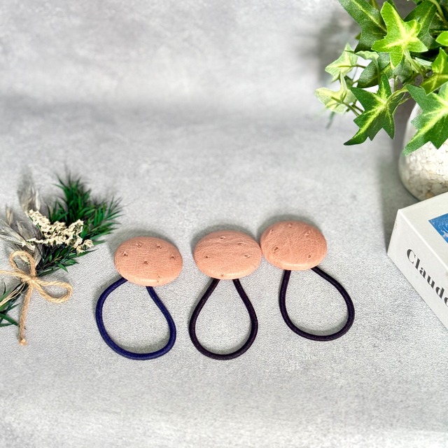 直径4cm程のヘアゴムです うっすら桜のようなピンクにも見えるベージュです 様々な革を使ってますので、カラーバリエーション豊富です。その日の気分に合わせて使い分けするのも良いかと。