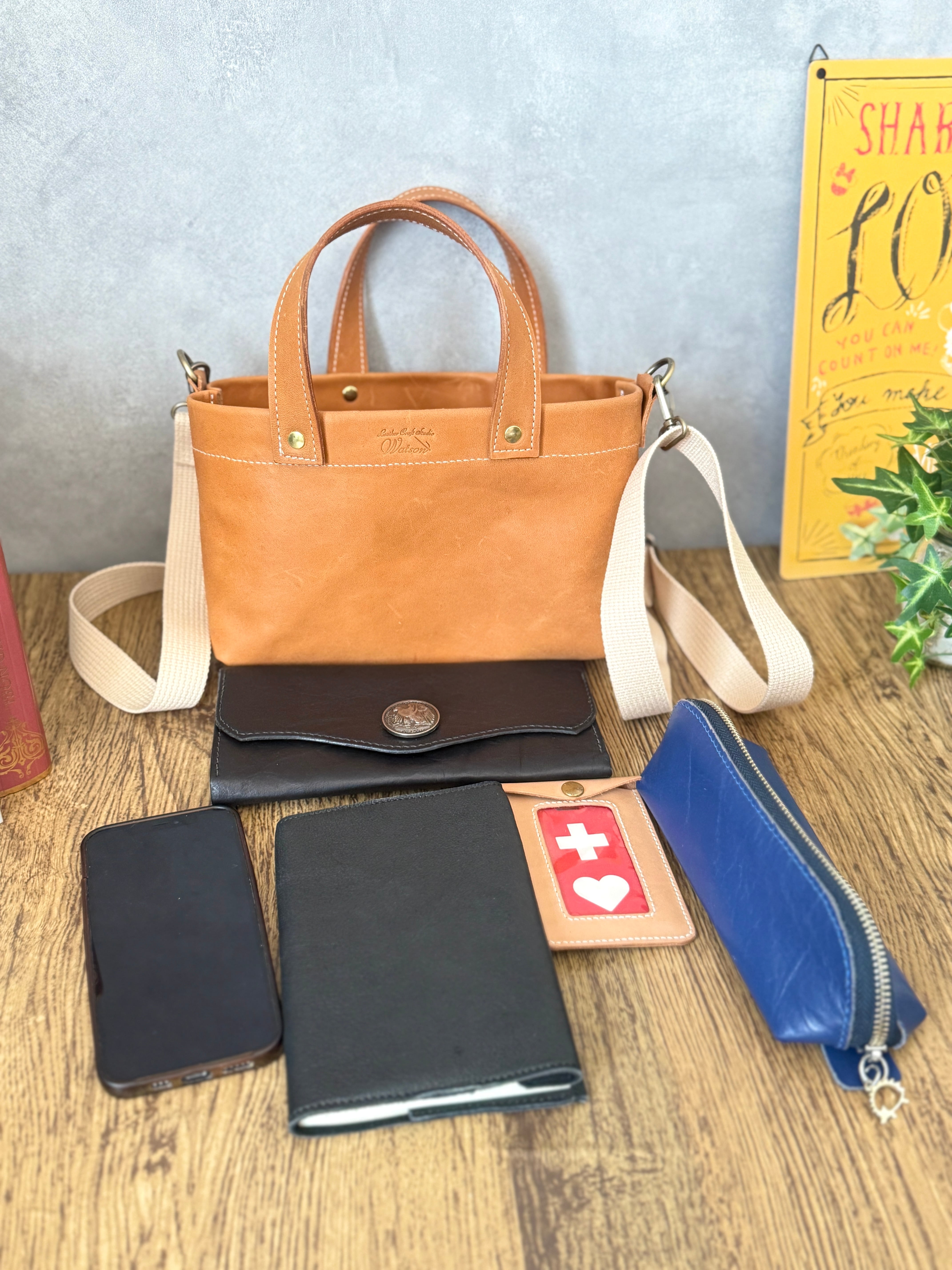 縁起の良い馬革のバッグとともに、
